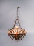 Hand wrought gilded brass mission style hanging fixture with hand-painted Italian openwork Faience Shade. 14" h x 20" sq. Hand wrought gilded brass mission style hanging fixture with hand-painted Italian openwork Faience Shade. 14" h x 20" sq.