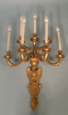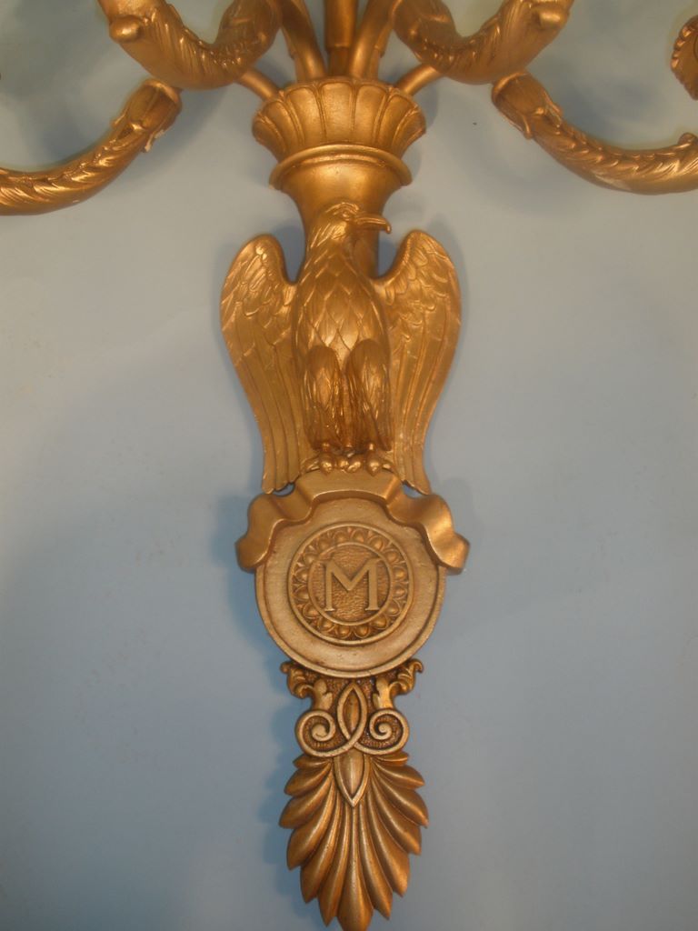 Nine (9), Seven 7 Light Brass or Bronze Wall Sconces. Arms supported by eagle standing on circle with M inside all supported by acanthus leaf. 41"h x 25"w. Nine (9), Seven 7 Light Brass or Bronze Wall Sconces. Arms supported by eagle standing on circle with M inside all supported by acanthus leaf. 41"h x 25"w.