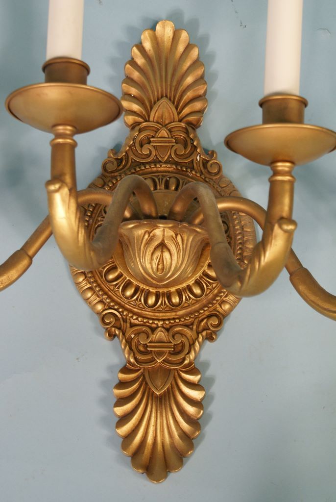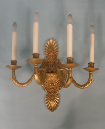 Fifteen 15, Four Light Brass or Bronze Sconces. Acanthus leaf design w/center circle having four arms all supported by acanthus leaf. 20"h x 23"w Fifteen 15, Four Light Brass or Bronze Sconces. Acanthus leaf design w/center circle having four arms all supported by acanthus leaf. 20"h x 23"w
