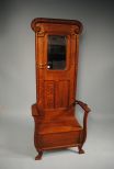 Turn of the century hall tree. Carved crest w/beveled mirror, four brass hooks, panel center leading to lift top seat. All supported by claw feet. 6'6"h x 2'2"w Turn of the century hall tree. Carved crest w/beveled mirror, four brass hooks, panel center leading to lift top seat. All supported by claw feet. 6'6"h x 2'2"w