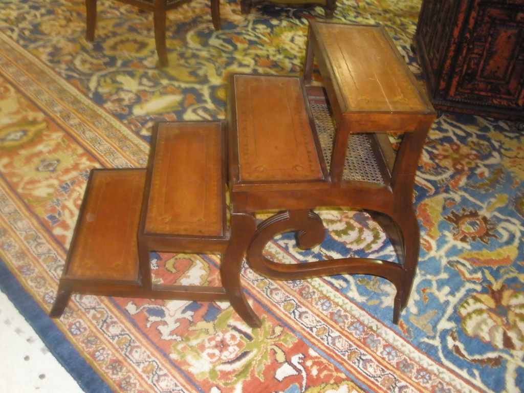 Library Step Ladder Chair with Cane seat, S scroll which makes into step ladder. Four leather covered steps. Steps 40"d x 27"h Library Step Ladder Chair with Cane seat, S scroll which makes into step ladder. Four leather covered steps. Steps 40"d x 27"h