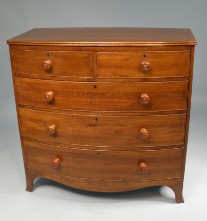 English Mahogany Bow Front Chest. Two drawers over three longer drawers, wood pulls. Beautiful apron ending in splay feet. 41 1/2"w x 21 1/2"d x 40 1/2"h English Mahogany Bow Front Chest. Two drawers over three longer drawers, wood pulls. Beautiful apron ending in splay feet. 41 1/2"w x 21 1/2"d x 40 1/2"h