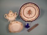 Lot of 5 Items includes plate, bowl, covered sugar, blue stopper, toothbrush holder Lot of 5 Items includes plate, bowl, covered sugar, blue stopper, toothbrush holder