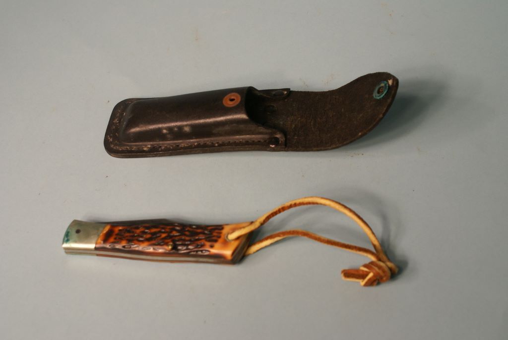 Adventure B.S.A. Pocket Knife, Camillius, N.Y., in black leather case. 4 1/2"long w/4"blade Adventure B.S.A. Pocket Knife, Camillius, N.Y., in black leather case. 4 1/2"long w/4"blade