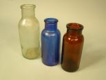 Group of 3 Bottles - one slight green tint 8 1/2"h; one bromo seltzer blue Baltimore bottle 6 1/2"h; one brown milks emulsion 6 1/2"h Group of 3 Bottles - one slight green tint 8 1/2"h; one bromo seltzer blue Baltimore bottle 6 1/2"h; one brown milks emulsion 6 1/2"h