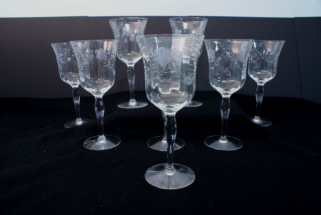 Set of 8 Stemware Water Glasses with floral design etched on sides., h. 7 3/4. Set of 8 Stemware Water Glasses with floral design etched on sides., h. 7 3/4.