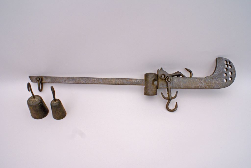 Very old iron scale with 2 weights and engraved J.H. TPACHY on side from Quebec, w. 30 1/2". Very old iron scale with 2 weights and engraved J.H. TPACHY on side from Quebec, w. 30 1/2".