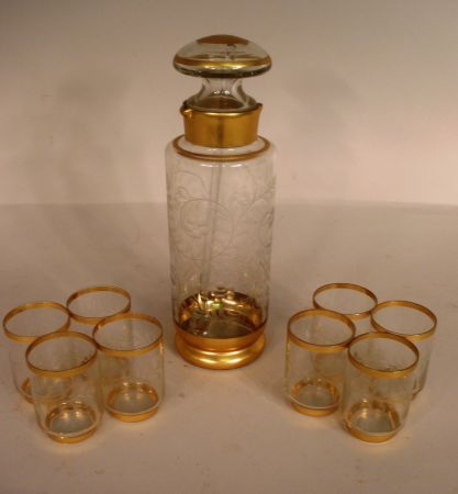 Pretty etched glass decanter and cups with gold leaf accents from Czechoslovakia. Set includes glass stick for mixing. Pretty etched glass decanter and cups with gold leaf accents from Czechoslovakia. Set includes glass stick for mixing.