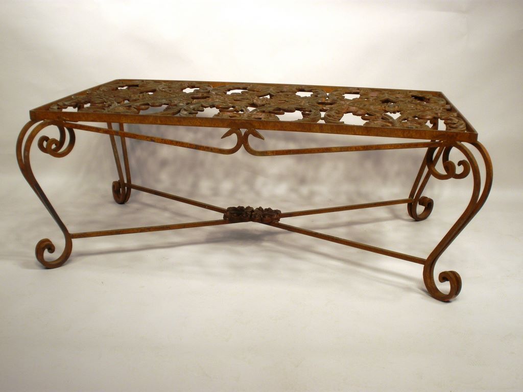 Heavy iron piece from old gate made into Coffee Table with Decorative Bowed Legs and thick hand chiseled glass top, Glass top custom made by Andy Young at Pearl River Glass Studio. 18 h 45 1/2 w 29 d Heavy iron piece from old gate made into Coffee Table with Decorative Bowed Legs and thick hand chiseled glass top, Glass top custom made by Andy Young at Pearl River Glass Studio. 18 h 45 1/2 w 29 d