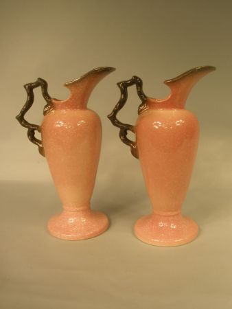 Pair of Royal Woodland Ewers by Hull Pottery. Pink base with grey accents. 14 H 6 1/2 W Pair of Royal Woodland Ewers by Hull Pottery. Pink base with grey accents. 14 H 6 1/2 W