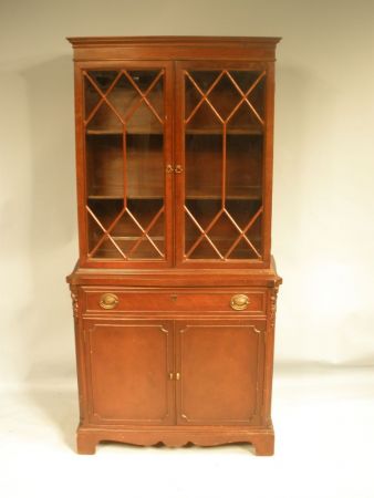 Nice Mahogany Double Door Display Cabinet with wood trim glass doors. Lower section has drawer and double door storage-h. 68" x w. 33" d. 15" Nice Mahogany Double Door Display Cabinet with wood trim glass doors. Lower section has drawer and double door storage-h. 68" x w. 33" d. 15"