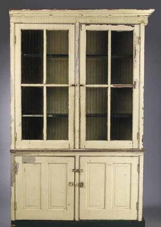 Large Primitive Pine or Cypress Cabinet, with two glass doors at top followed by two wooden paneled cabinet doors at bottom. Large Primitive Pine or Cypress Cabinet, with two glass doors at top followed by two wooden paneled cabinet doors at bottom.