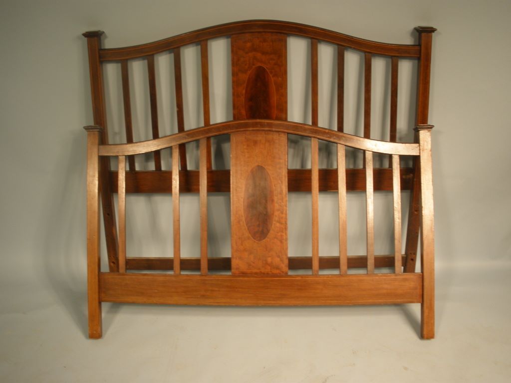 Nice full size Mahogany bed with inlaid wood details. Short squared- off posts, h. 40", w. 53 3/4". Nice full size Mahogany bed with inlaid wood details. Short squared- off posts, h. 40", w. 53 3/4".