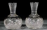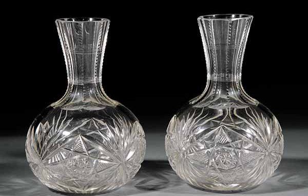 Nice Pair of Cut Glass Water Carafes. One has a large chip on the rim. Nice Pair of Cut Glass Water Carafes. One has a large chip on the rim.