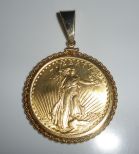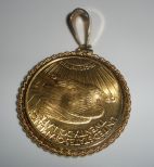1924 Standing Liberty Gold Coin Pendant, weight 39.4 grams. Coin is encased in 14 kt. Gold rope design edge with large Bail. 1924 Standing Liberty Gold Coin Pendant, weight 39.4 grams. Coin is encased in 14 kt. Gold rope design edge with large Bail.