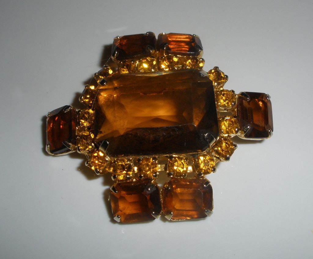 Very pretty Ladies Light Brown Topaz Broach. The broach features an Emerald Cut Brown Topaz in the center surrounded by 17 small gold stones. Six smaller Brown Topaz stones are mounted on the outside edge of the broach. The broach features a Gold clasp with soflite hooks. Very pretty Ladies Light Brown Topaz Broach. The broach features an Emerald Cut Brown Topaz in the center surrounded by 17 small gold stones. Six smaller Brown Topaz stones are mounted on the outside edge of the broach. The broach features a Gold clasp with soflite hooks.