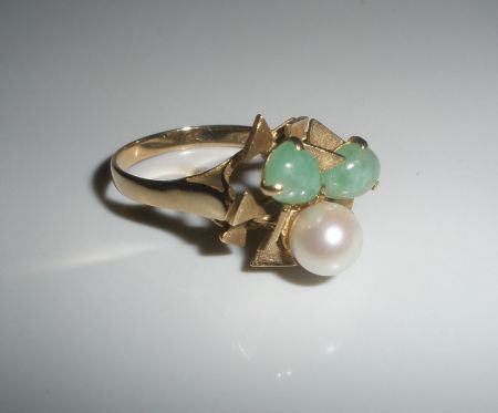 Ladies 14k Gold Ring with two Jade Stones on each side of one Mother of Pearl in Center. Very pretty ring., Ladies 14k Gold Ring with two Jade Stones on each side of one Mother of Pearl in Center. Very pretty ring.,