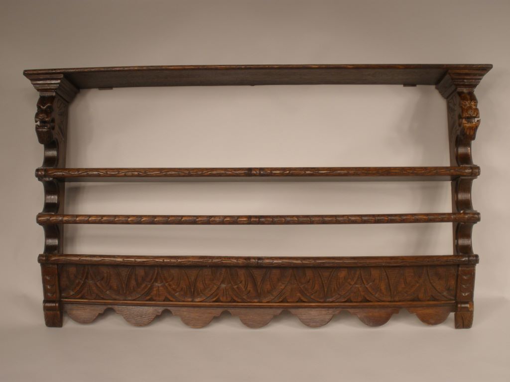 Old ornate carved plate rack with lion head carvings purchased from John Grafe at the Ear Elephant , 27 1/4 h 48 w Old ornate carved plate rack with lion head carvings purchased from John Grafe at the Ear Elephant , 27 1/4 h 48 w