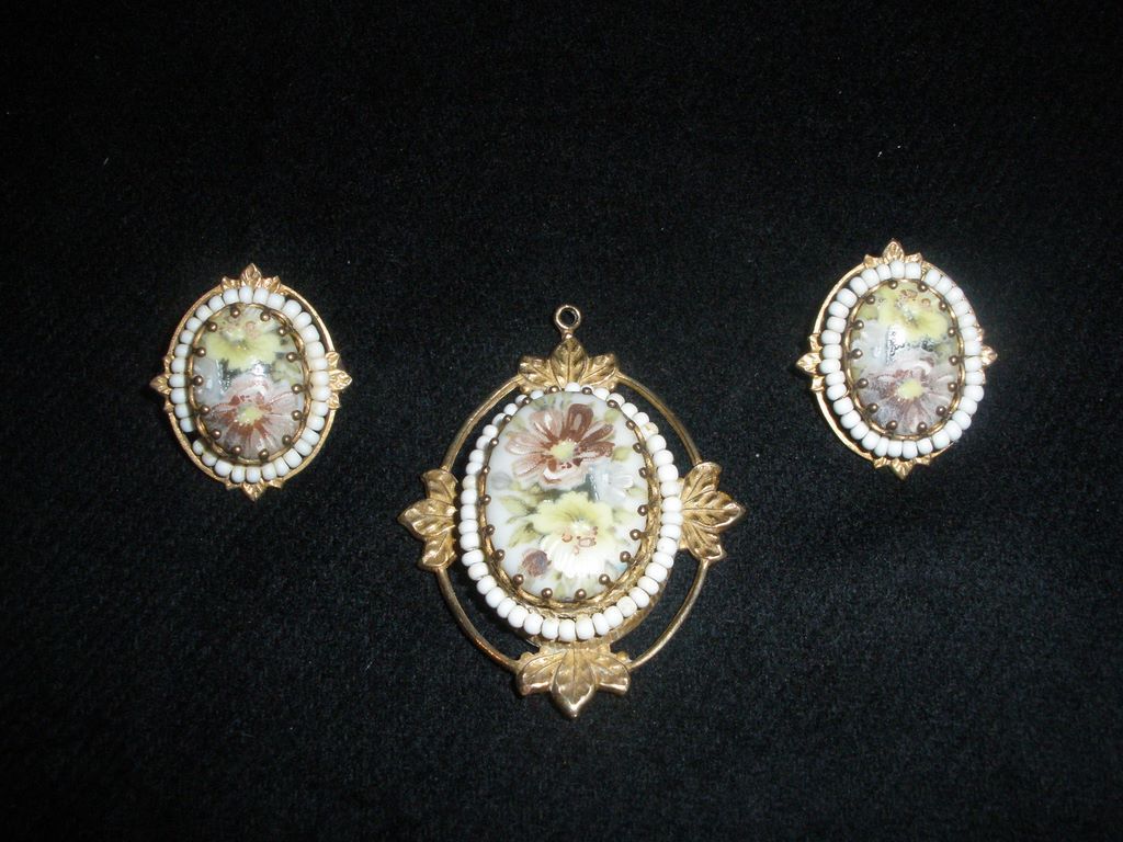 Beautiful Miriam Haskell Necklace and Clip on Earrings. Set is hand painted in excellent condition. Beautiful Miriam Haskell Necklace and Clip on Earrings. Set is hand painted in excellent condition.