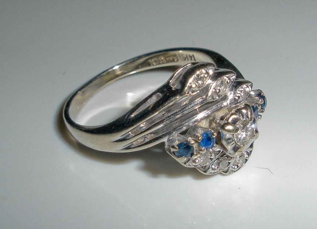 Ladies 14 Kt. Gold Ring with 1 Center Diamond With 6 Smaller Diamonds on Each Side With 4 Sapphires. Ladies 14 Kt. Gold Ring with 1 Center Diamond With 6 Smaller Diamonds on Each Side With 4 Sapphires.