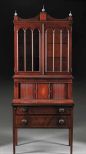 19th c. and later, pediment with brass finials, Gothic glazed doors above tambour compartment and urn inlaid door; foldover desk surface, two graduated drawers, height 87 in., width 36 in., depth 18 in. 19th c. and later, pediment with brass finials, Gothic glazed doors above tambour compartment and urn inlaid door; foldover desk surface, two graduated drawers, height 87 in., width 36 in., depth 18 in.