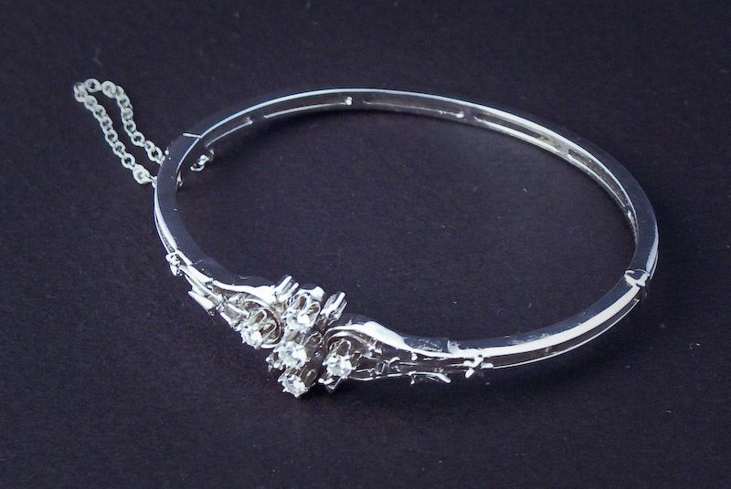 Gorgeous Ladies 14Kt White Gold Bracelet with Five Diamonds. Bracelet is solid band that crests to scroll design mounted with 1 center diamond surrounded by 4 additional diamonds. Gorgeous Ladies 14Kt White Gold Bracelet with Five Diamonds. Bracelet is solid band that crests to scroll design mounted with 1 center diamond surrounded by 4 additional diamonds.