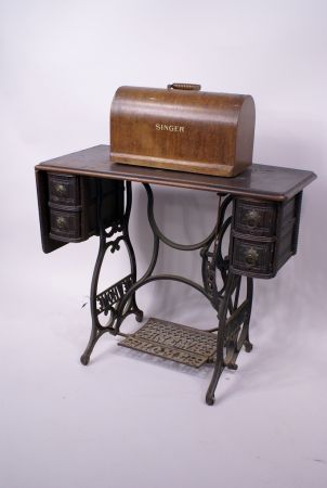 Singer Peddle Sewing Table, metal and wood, with original machine cover, 29 1/2 H 34 1/2 W 17 1/4 D Singer Peddle Sewing Table, metal and wood, with original machine cover, 29 1/2 H 34 1/2 W 17 1/4 D