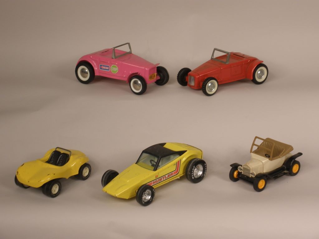 Hustler (yellow) Car, Tonka Yellow car, Red Roadster Ford, Pink Roadster, Buddy L. Hustler (yellow) Car, Tonka Yellow car, Red Roadster Ford, Pink Roadster, Buddy L.