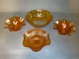 Set include 3 ruffled edge nut bowls and 1 amber colored basketweave pattern bowl. Set include 3 ruffled edge nut bowls and 1 amber colored basketweave pattern bowl.