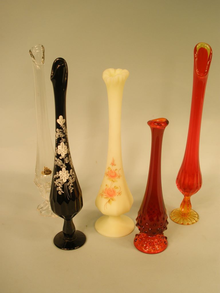 Set of 5 Fenton Bud Vases, pink blossoms on satin glass, Red hobnail, Red graduating to yellow swung, clear swung, white blossoms on ebony. Set of 5 Fenton Bud Vases, pink blossoms on satin glass, Red hobnail, Red graduating to yellow swung, clear swung, white blossoms on ebony.