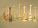 Set of 8 Fenton miniature bud vases, 5 blossoms on satin glass, 1 strawberry blossom on high gloss white, 1 floral on high gloss white, 1 opalescent gray, h. 7-9". Set of 8 Fenton miniature bud vases, 5 blossoms on satin glass, 1 strawberry blossom on high gloss white, 1 floral on high gloss white, 1 opalescent gray, h. 7-9".