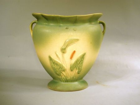 Hull Pottery Vase. Calla Lily Pattern (1938). Pattern also referred to as Jack - in - Pulpit. Unmarked, h. 9 ", w. 10". Hull Pottery Vase. Calla Lily Pattern (1938). Pattern also referred to as Jack - in - Pulpit. Unmarked, h. 9 ", w. 10".