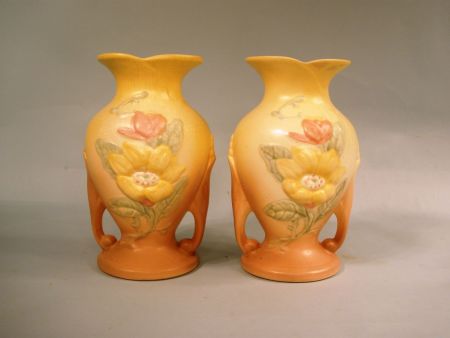 Pair of small matching Hull vases with low level double handles, Magnolia Matte pattern, h. 9", w. 5 1/2" Pair of small matching Hull vases with low level double handles, Magnolia Matte pattern, h. 9", w. 5 1/2"