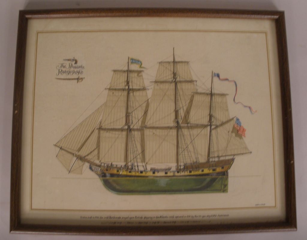 Print "The Privateer Rattlesnake" by Joseph A. Phelan, print is of a ship built in Boston 1780, 17"H x 21"W Print "The Privateer Rattlesnake" by Joseph A. Phelan, print is of a ship built in Boston 1780, 17"H x 21"W