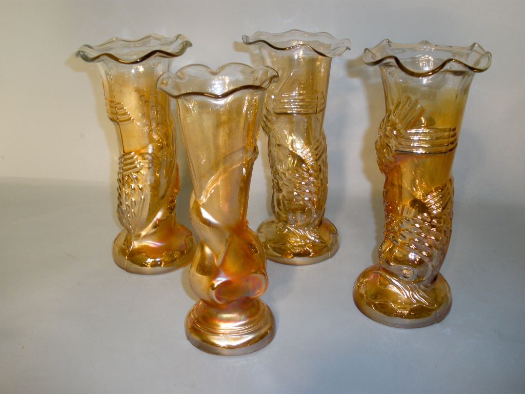 3 Amber colored carnival glass vases in the shape of fish and one amber colored carnival glass vase .9 H 5 W, 9H 2 1/2 W 3 Amber colored carnival glass vases in the shape of fish and one amber colored carnival glass vase .9 H 5 W, 9H 2 1/2 W