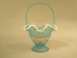 Fenton Opalescent Blue Basket Vase with Snow Crest ruffled edge. Charleston collection. Hand painted by B. Williams. 9 1/2 H 6 W Fenton Opalescent Blue Basket Vase with Snow Crest ruffled edge. Charleston collection. Hand painted by B. Williams. 9 1/2 H 6 W