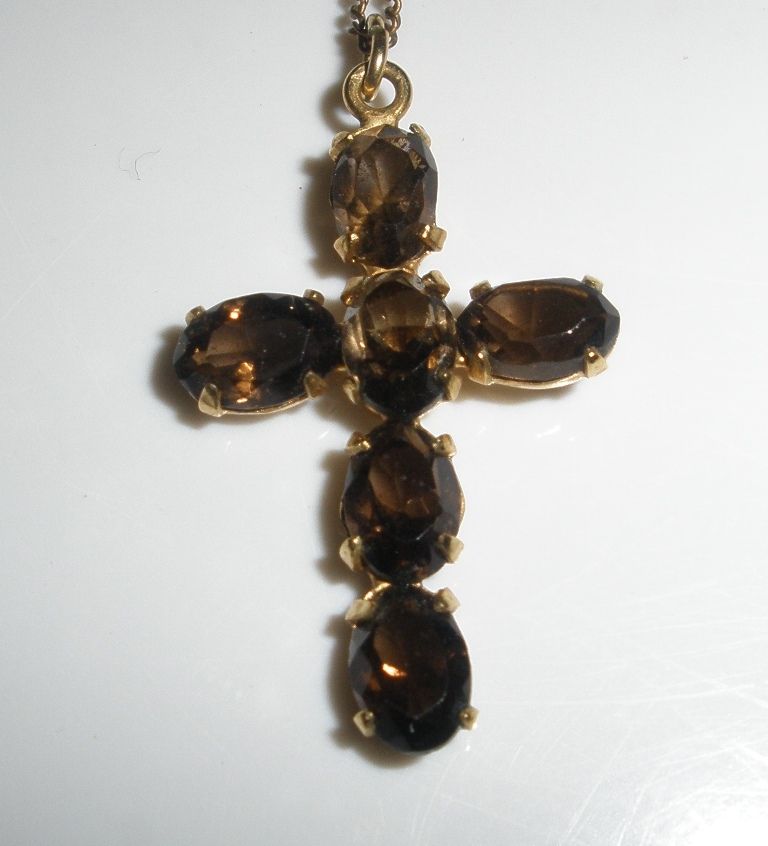 Beautiful Ladies Cross Necklace featuring 6 smoky Topaz Stones. Necklace is 18" long. Cross is l. 1", w. 1/2". Beautiful Ladies Cross Necklace featuring 6 smoky Topaz Stones. Necklace is 18" long. Cross is l. 1", w. 1/2".