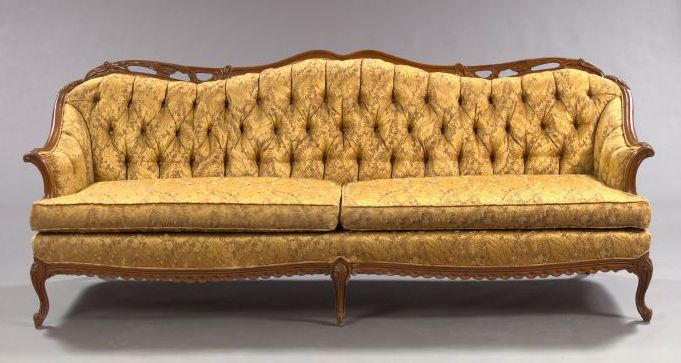 French-Style Stained Mahogany Sofa, early 20th century, the back crest and frame molded and pierce carved over a deeply padded and diamond-tufted back, the seat with two reversible cushions, raised on cabriole legs, h. 34-1/2", w. 84", d. 29". French-Style Stained Mahogany Sofa, early 20th century, the back crest and frame molded and pierce carved over a deeply padded and diamond-tufted back, the seat with two reversible cushions, raised on cabriole legs, h. 34-1/2", w. 84", d. 29".