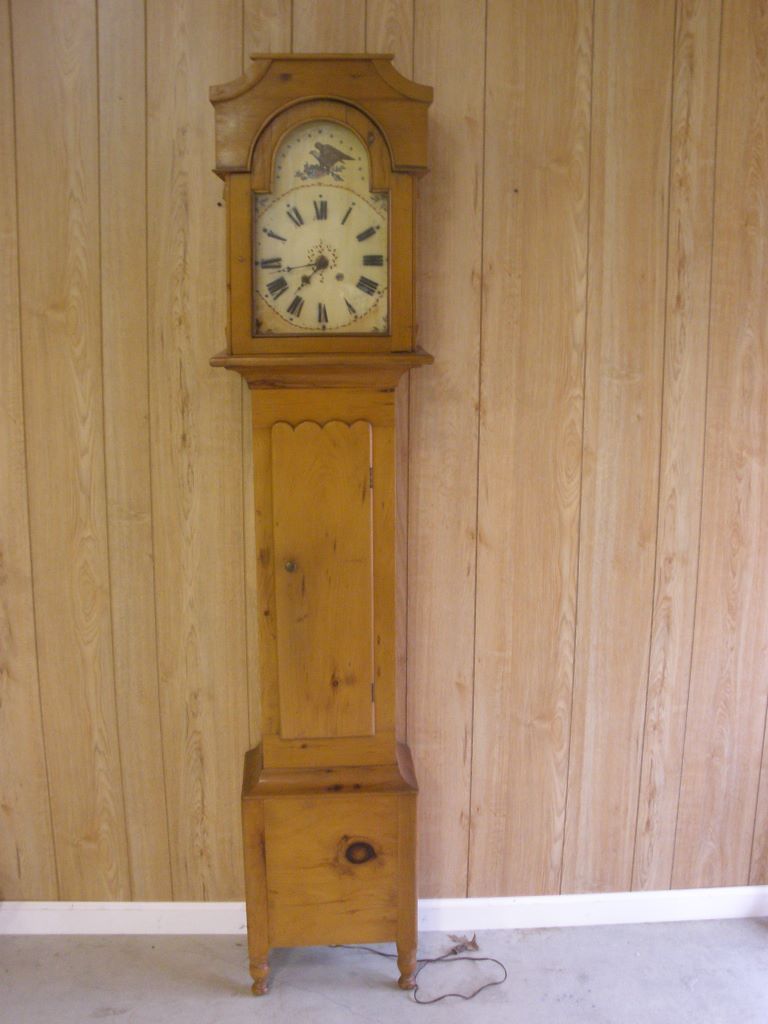 Nice Electric Grandfather Style clock made of Pine. Decorative hand-painted clock face with American Eagle at top, h. 6'5", w. 16 1/2", d. 11 1/2". Nice Electric Grandfather Style clock made of Pine. Decorative hand-painted clock face with American Eagle at top, h. 6'5", w. 16 1/2", d. 11 1/2".