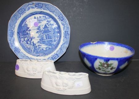 Group of Pottery Two German bisque flower holders 6"w., 2"h., and early ceramic oriental bowl (chip on rim) 7"dia., early 9" blue and white stoneware plate (age crack). Group of Pottery Two German bisque flower holders 6"w., 2"h., and early ceramic oriental bowl (chip on rim) 7"dia., early 9" blue and white stoneware plate (age crack).