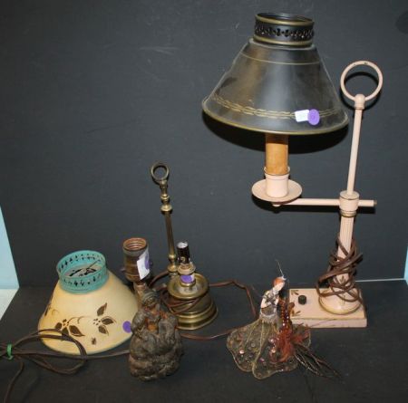 113 Pink Tole Lamp, Tole Shade, Brass Lamp, and Vintage Lady Boudoir Lamp Pink Tole Lamp 18"h., Tole Shade, Brass Lamp 10"h., and Vintage Lady Boudoir Lamp 8"h.
