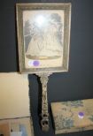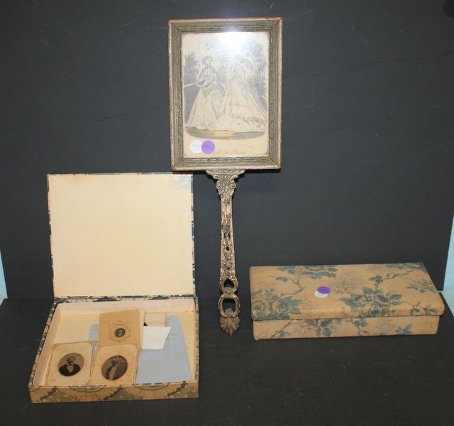 Vintage Mirror Frame with Godey Print and Two Cloth Covered Boxes Vintage Mirror Frame with Godey Print and Two Cloth Covered Boxes