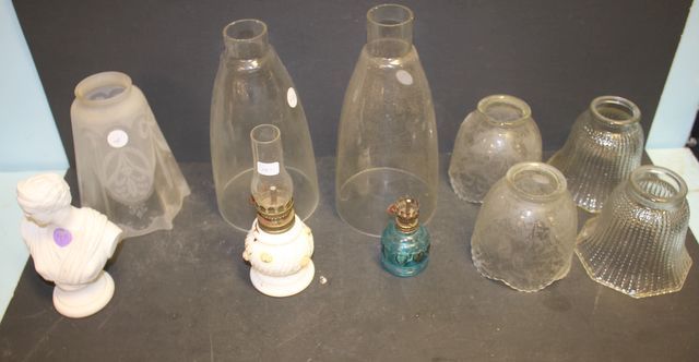Seven Glass Shades, Bisque Bust, and Mini Oil Lamps shades 6"h. Seven Glass Shades, Bisque Bust, and Mini Oil Lamps shades 6"h.