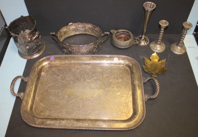166 Silverplate Tray, Candlesticks, Vase, and Casserole Frame Silverplate Tray, Candlesticks, Vase, and Casserole Frame