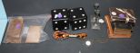 176 Wood Dice, Mini Candlesticks, Mini Size Books, Glasses, and Mandelin wood dice 2"sq., Mandelin 5".