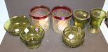 Two Cranberry Rim Candleholders, Two Green Glass Urns, and Three Green Bowls Two Cranberry Rim Candleholders 6"h., Two Green Glass Urns 5"h., and Three Green Bowls Two Cranberry Rim Candleholders, Two Green Glass Urns, and Three Green Bowls Two Cranberry Rim Candleholders 6"h., Two Green Glass Urns 5"h., and Three Green Bowls