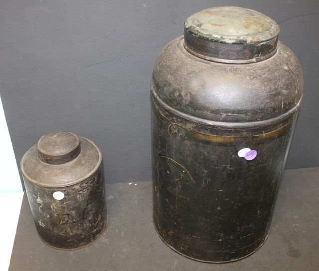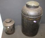 Two Antique Tin Canisters 9", 18"h. Two Antique Tin Canisters 9", 18"h.