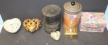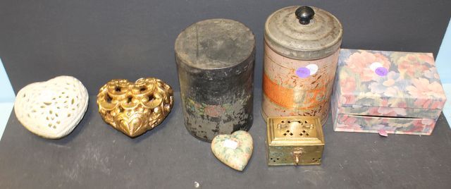 Various Boxes which are cloth, brass, and tin. Various Boxes which are cloth, brass, and tin.