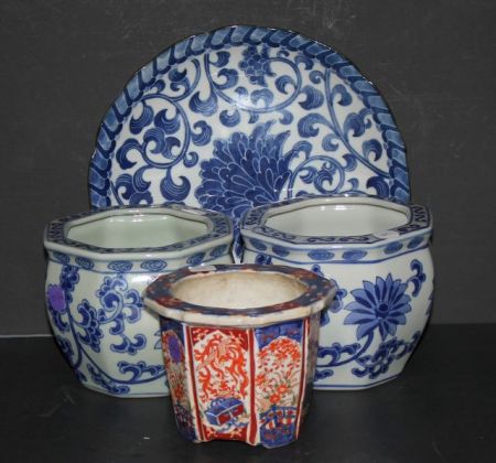351 Imari Style Flower Pot, Octagon Flower Pots, and Blue and White Plate Imari Style Flower Pot 5"dia., 4"h., 2" - 5" dia.Octagon Flower Pots, 10" Blue and White Plate