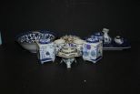 410 Grouping of Blue and White Porcelain, Tray, Small Jars, and Vases, Bowl 6"dia.